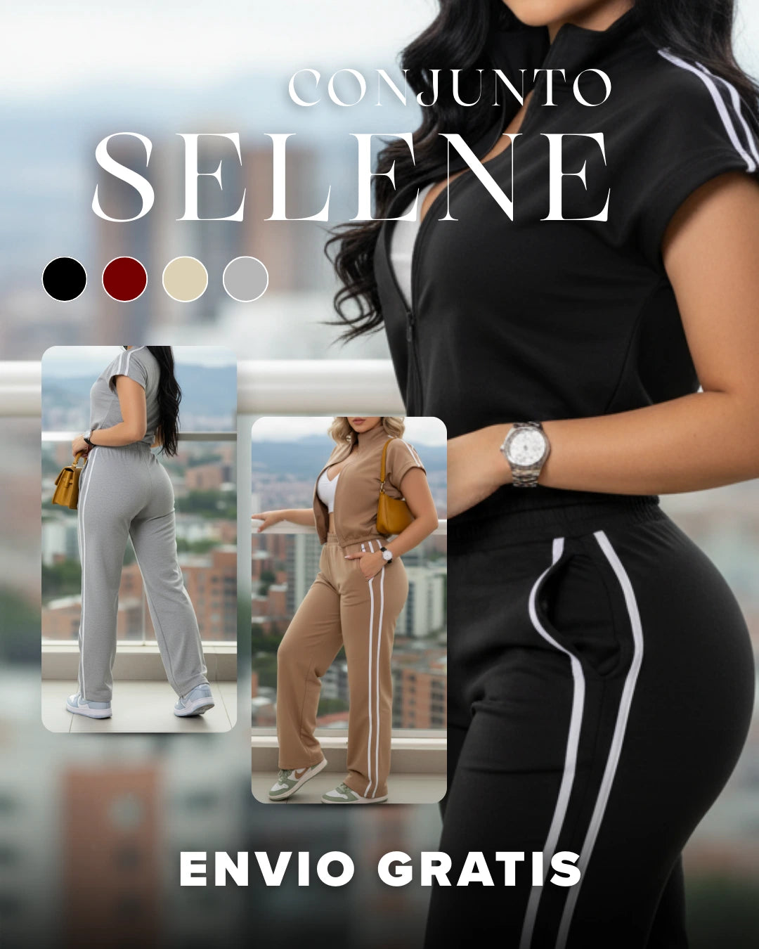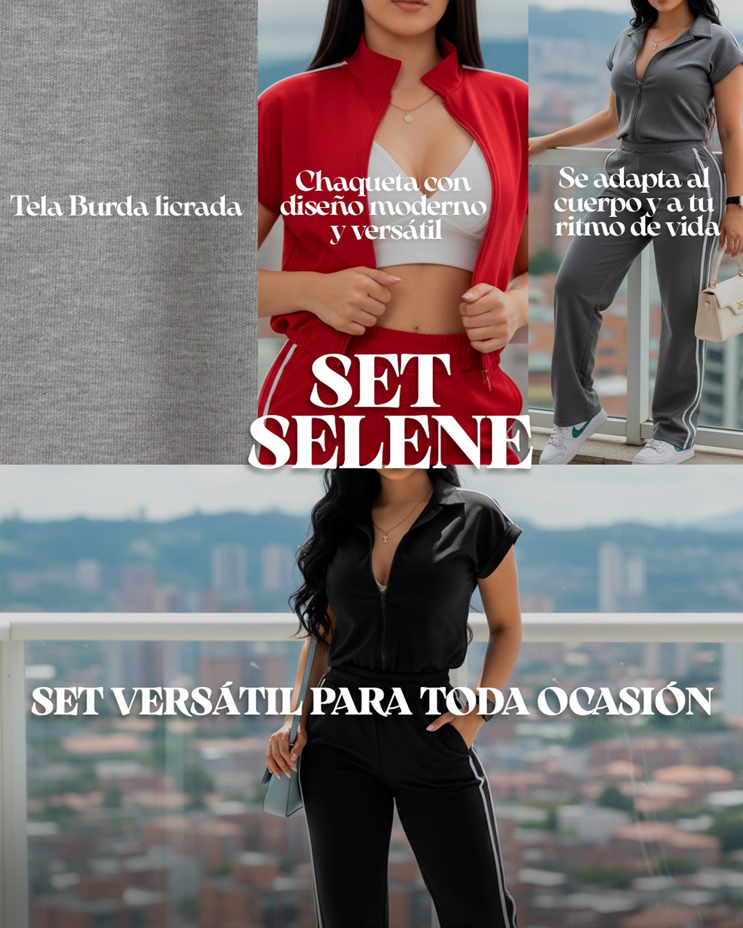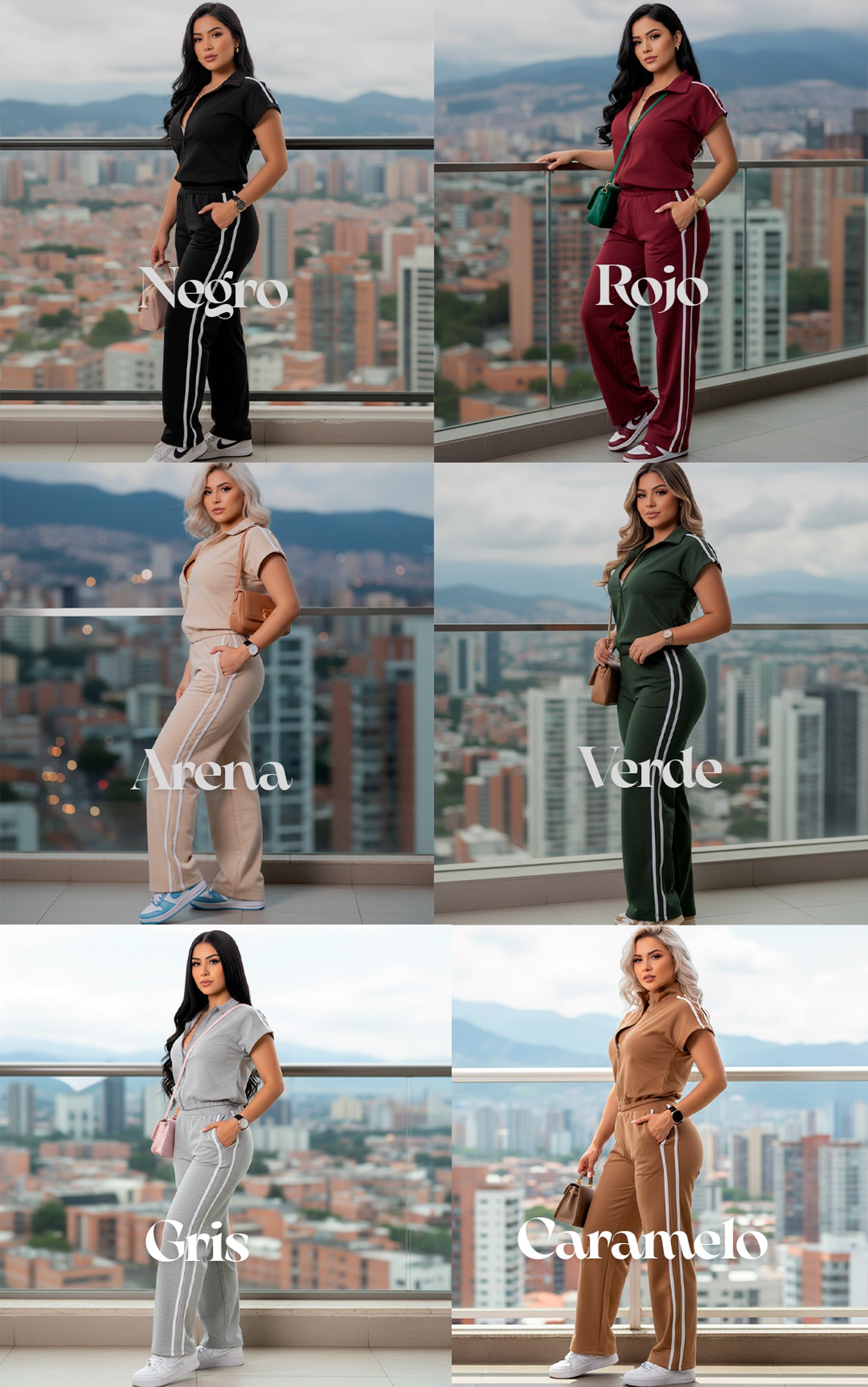 El conjunto viene en 6 colores modernos para que elijas el que mejor combine con tu estilo: Negro, chocolate, arena, gris, rojo, verde militar.