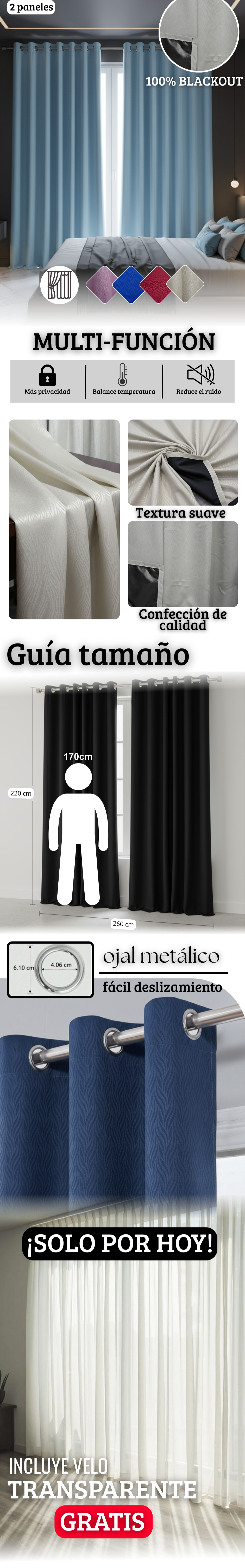 Las dimensiones de nuestras cortinas son de 220cm de alto y 130cm de ancho por cada panel, para un total de 260cm