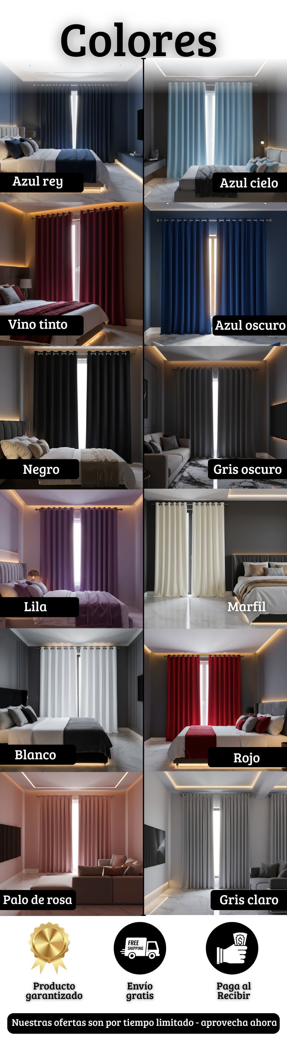Realizamos envíos rápidos a toda Colombia 🇨🇴. Una vez confirmado tu pedido, lo recibirás entre 2 a 4 días hábiles. Además, puedes pagar al recibir tu cortina sin necesidad de anticipos. ¡Compra segura, rápida y sin preocupaciones! 🚚