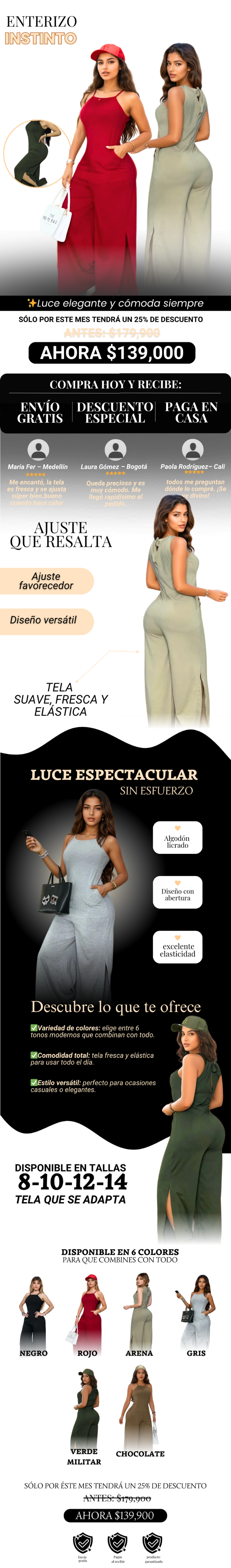 El enterizo viene en 6 colores modernos para que elijas el que mejor combine con tu estilo: Negro, chocolate, arena, gris, rojo, verde militar.